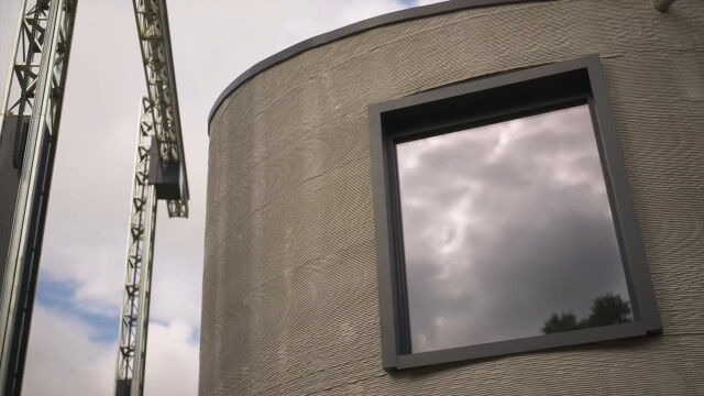 ヨーロッパ最大の3Dコンクリートプリンタで、2階建ての家を建てる様子