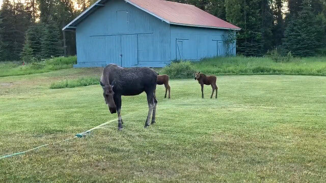 Moose Family Plays in Backyard Sprinklers || ViralHog