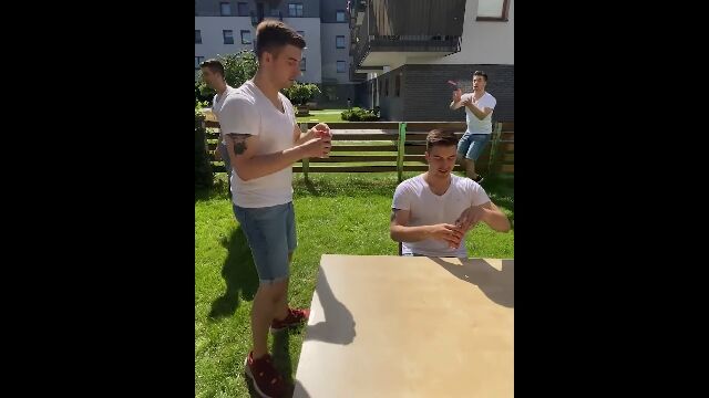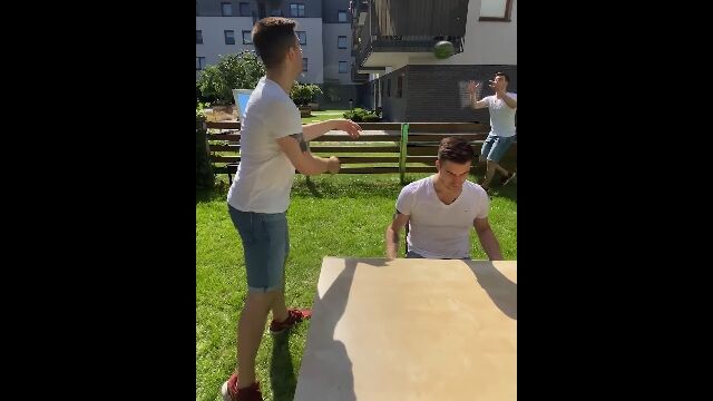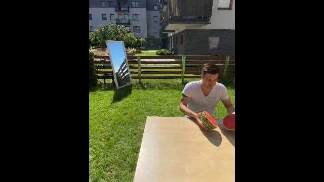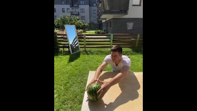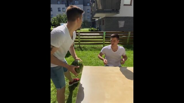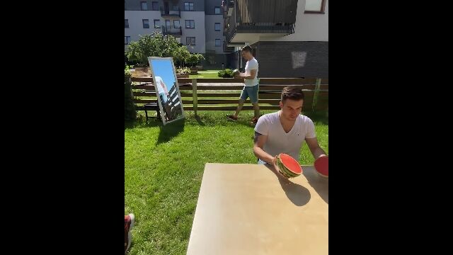 スイカをくっつけて自分にパスし、その自分がまた別の自分にパス。