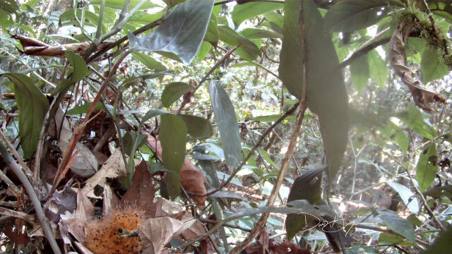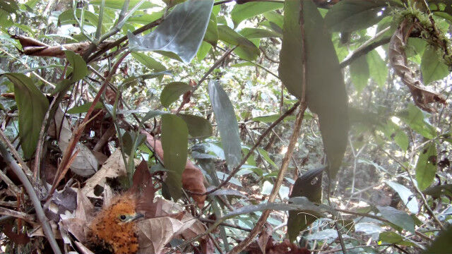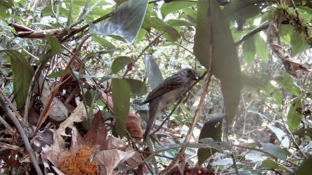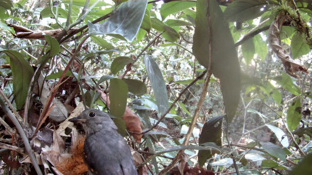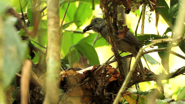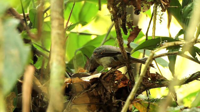 ハグロドリ科の鳥、ハイイロモンキタイランチョウの巣にて、雛鳥にエサを与える親鳥。