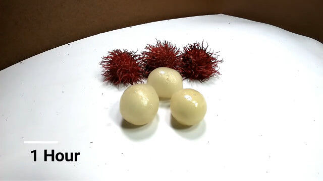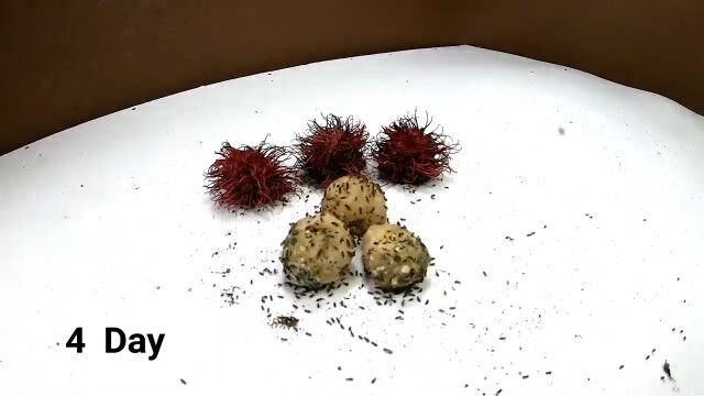 果皮を剥いたランブータン3個を5日間放置し、アリがたかるままにして撮影し続けたタイムラプス。