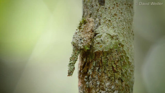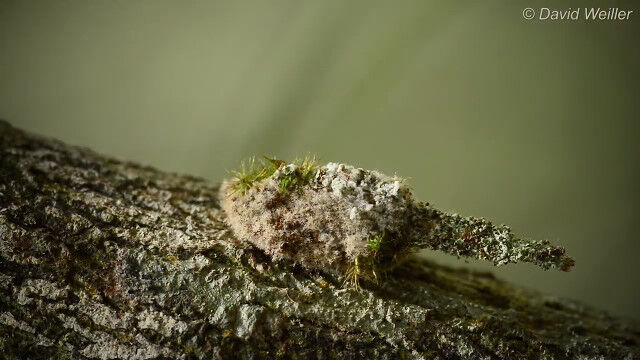 周囲の樹皮を集め固めた内部に住んでいるらしく、樹皮や枝が動いているようにしか見えないのが凄い。