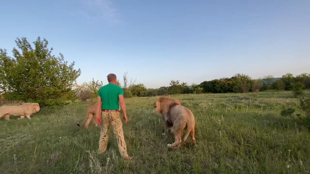 クリミア、ベロゴルスクのサファリパーク、「タイガン」のオレグ・ズブコフ園長が、怒れる雄ライオンたちの喧嘩を仲裁。