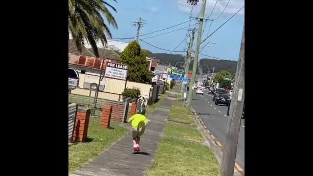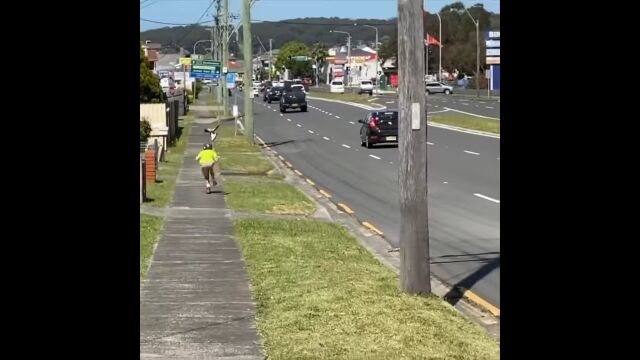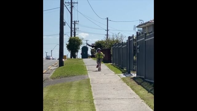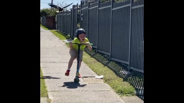 #カササギの猛烈なアタックに、悲鳴を上げて逃げていくキックボード少年