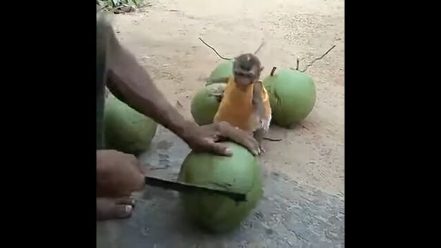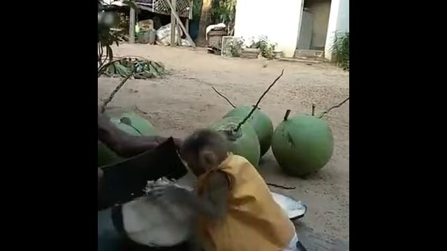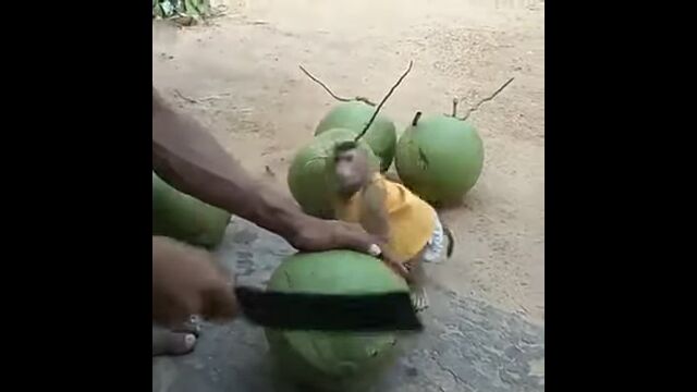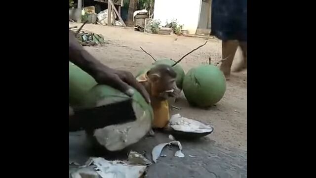 お兄さんがカットするココナッツから、ココナッツジュースがもらえるのを今か今かと待つサルの赤ちゃん。
