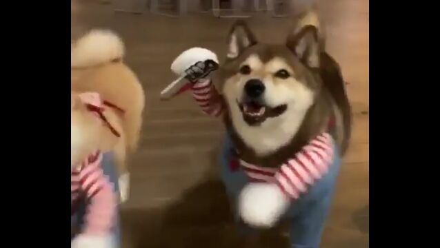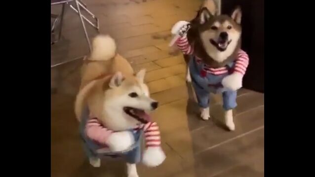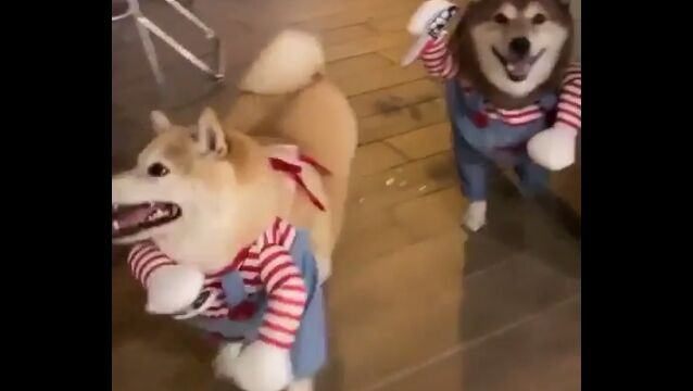 チャッキーなりきり柴犬2匹が可愛い。犬の二足歩行コスプレはやっぱり最高