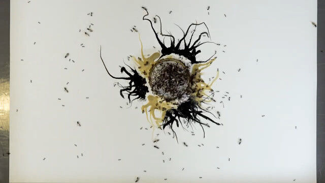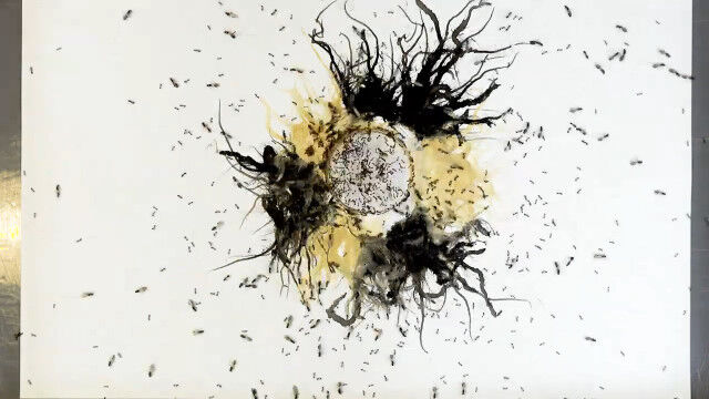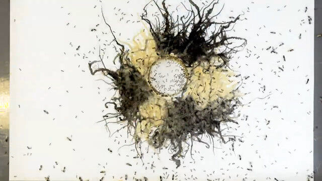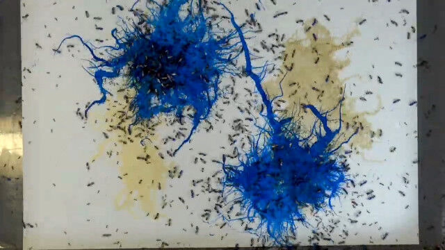 インクにまみれたヒアリがキャンバス上を這い回ることで描かれていくというアート。
