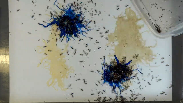 カラーインクの上にヒアリを這わせて描くというアート