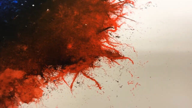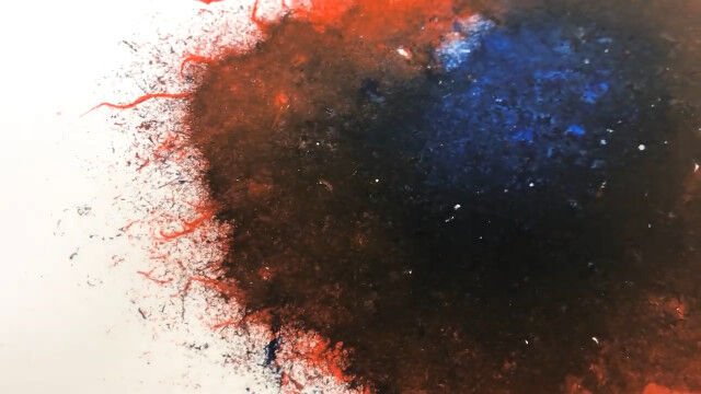 キャンバスの上にカラーインクを垂らし、大量のヒアリを投入。