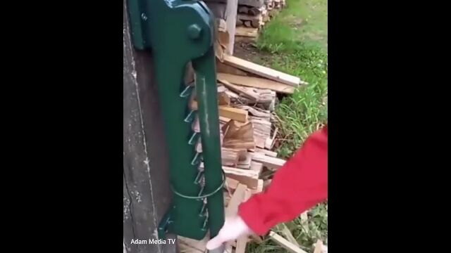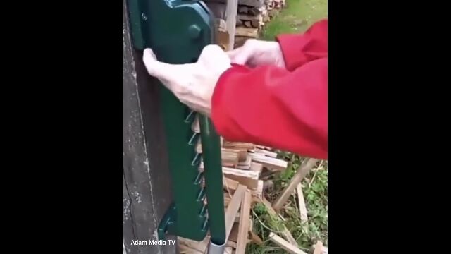 木製の柱に取り付けられた、薪割りのための装置。