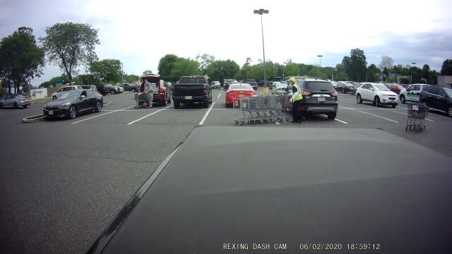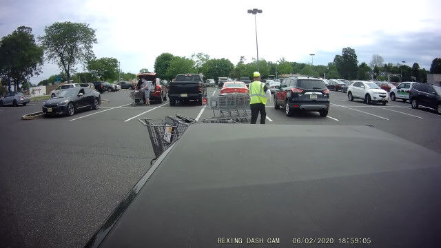 しかし彼、ショッピングカートの扱いに慣れていないのか、ひとまとめにしていたカートを分離させてしまったり、分離した一方をおさえている間にもう一方が滑っていってしまったりで、お客さんの車に何度もぶつけてしまうことに。