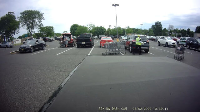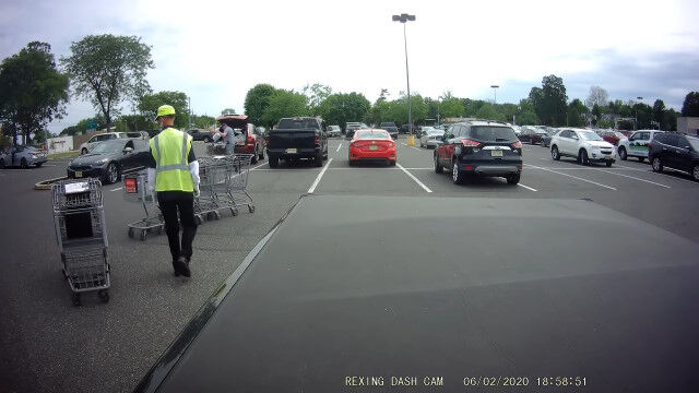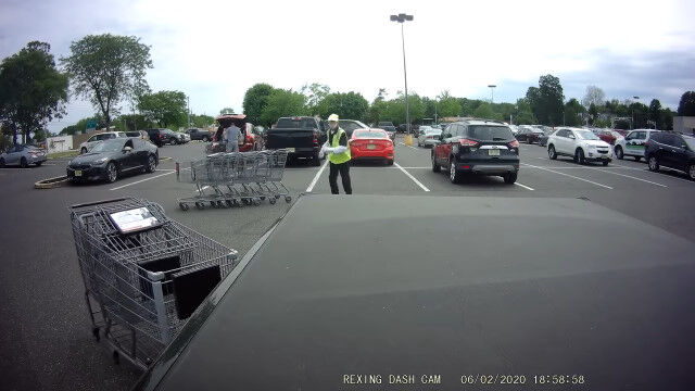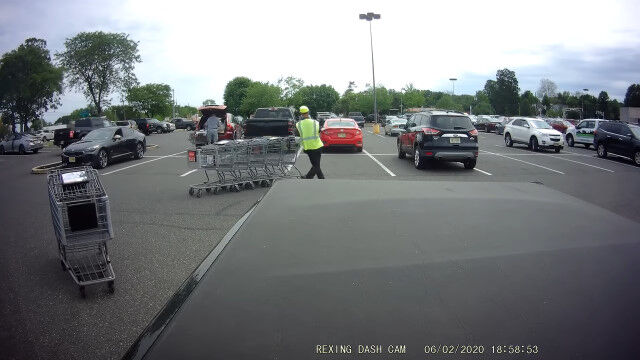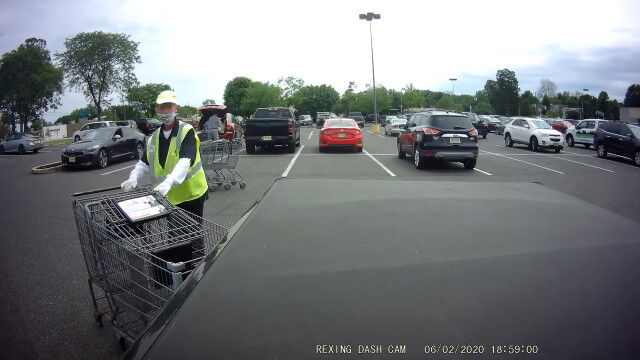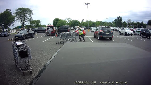 アメリカ、ニュージャージー州ウッドベリーハイツにあるスーパーマーケットの駐車場で、お客さんが放置したショッピングカートを回収する店員さん。