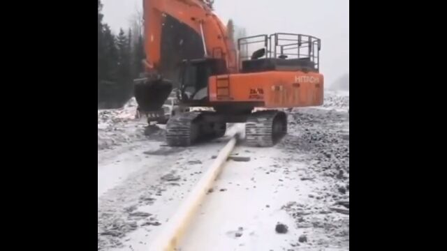 道路上に置かれた長いパイプを踏まないように、器用に乗り越えるショベルカー。