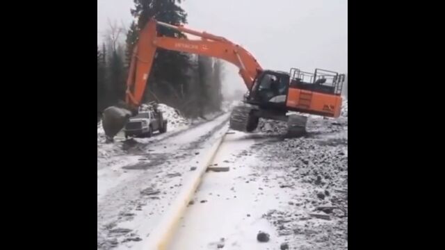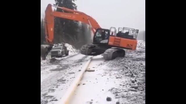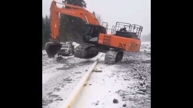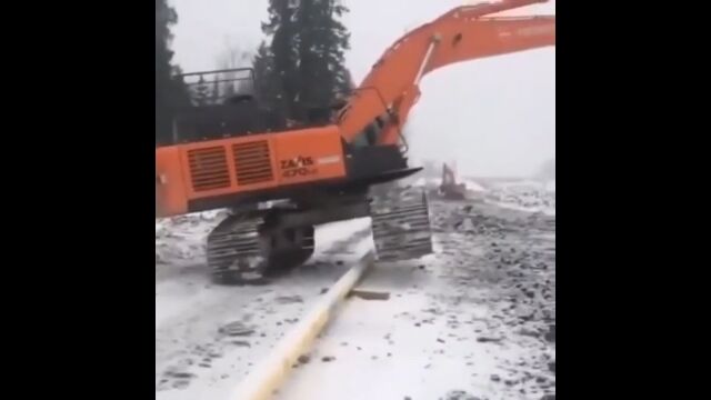 道路上のパイプをキャタピラで踏まないように、器用に乗り越えるショベルカー