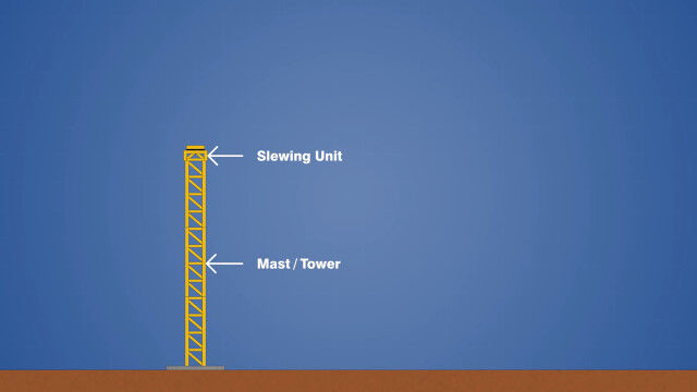 土台を固め、マスト(支柱)を建て、クレーン部分を持ち上げながら新しいマストを自分で追加していくタワークレーン。