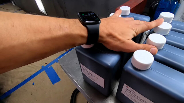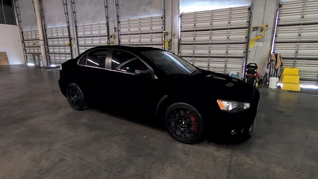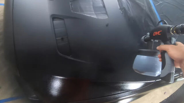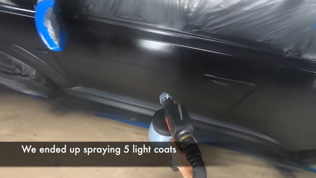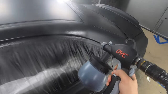 たっぷり用意した黒色無双を、もともとボディーが黒い車にスプレーし、さらなる黒さへと変貌させてしまうカーペイント系ユーチューバー。