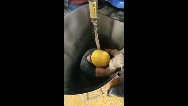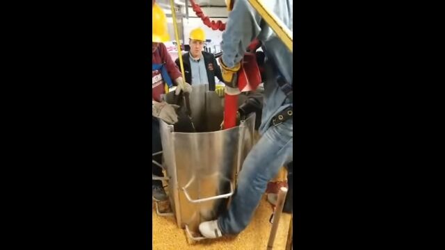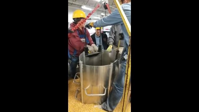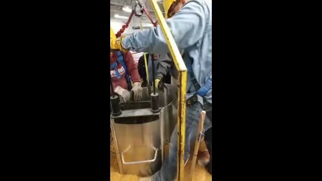 アメリカ、アイオワ州の消防局レスキュー隊員が行っている、穀物サイロに落ちた人間を引き上げる救助訓練。
