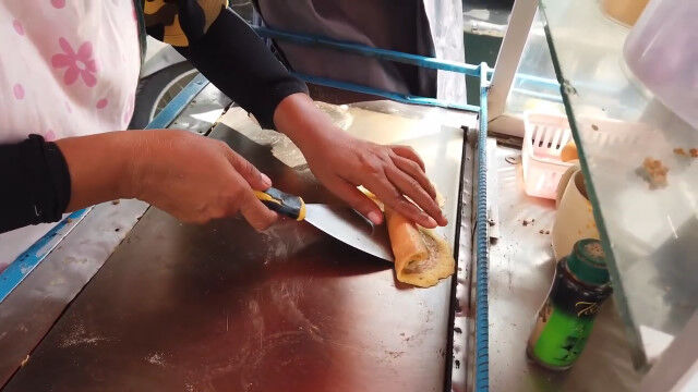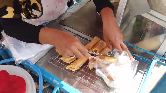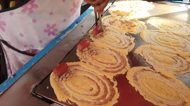 薄く伸ばしたクレープ生地に具材を乗せ、ロール状に丸めたようなタイのストリートフード「カノム・トーキョー」。