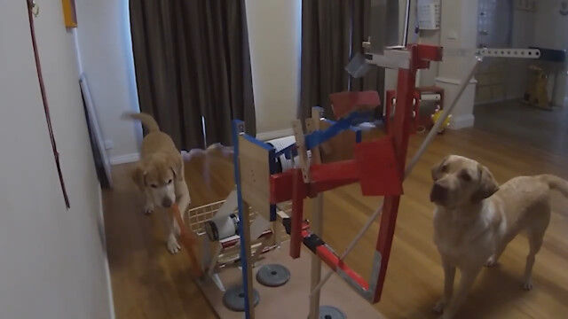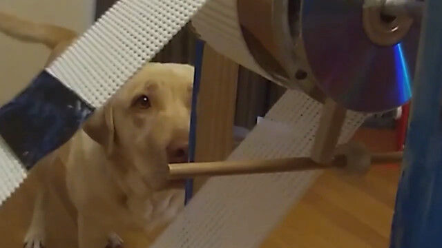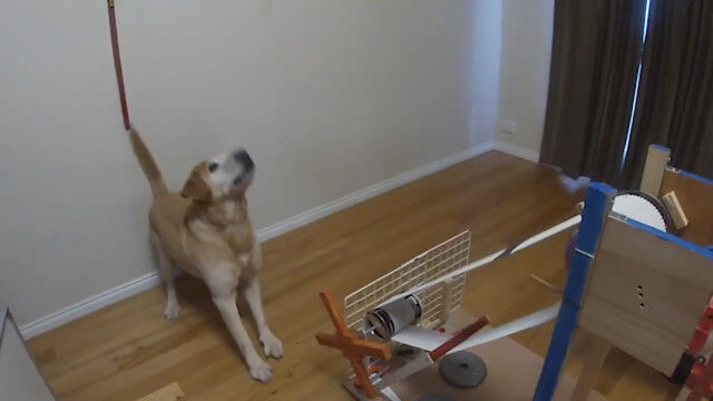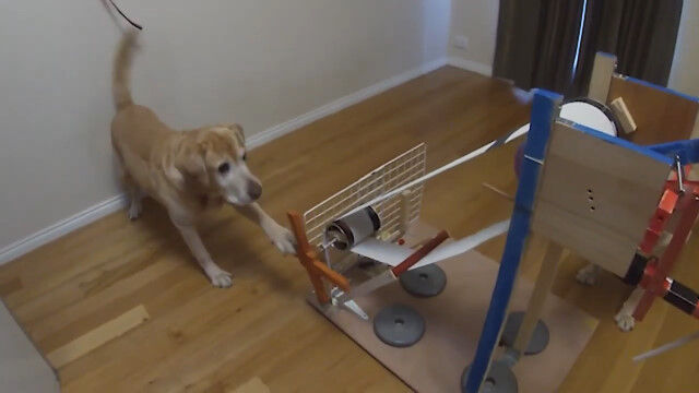 ハンドル回すとエサが飛ぶ。おやつを自分でゲットできる、犬用おやつカタパルト