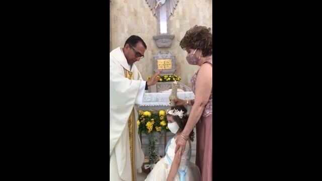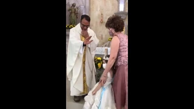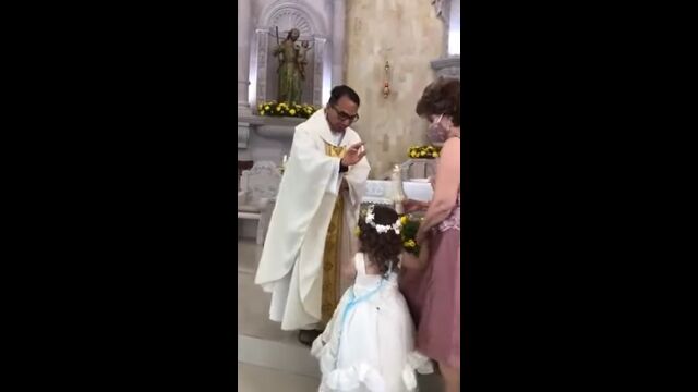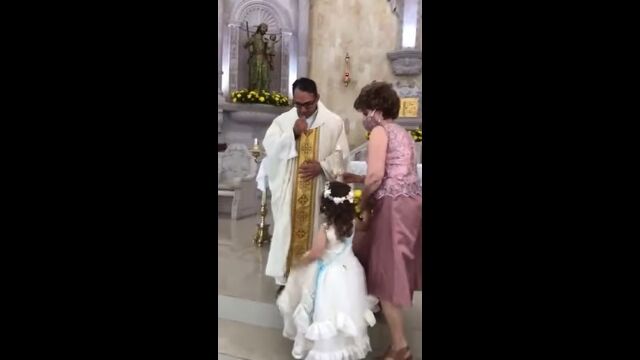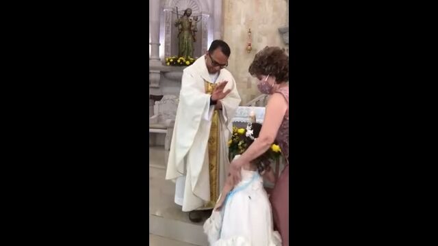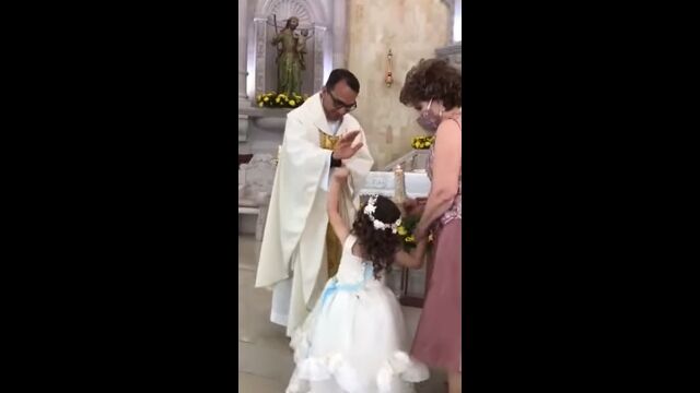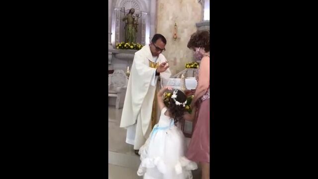 Little Girl Gives Priest High-Five As He Raises Hand To Bless Her