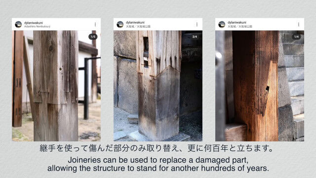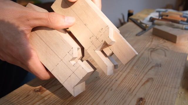 一見すると接続不可能な木材の継ぎ手、四方鎌継ぎ。職人技が凄い