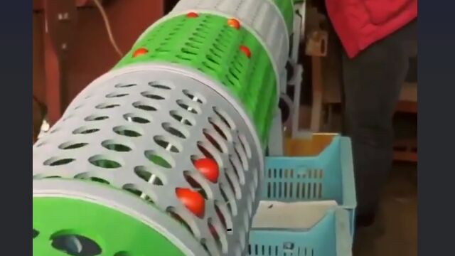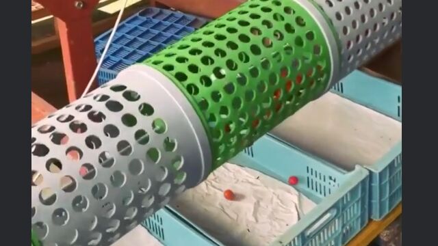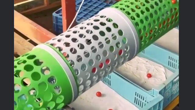 回転する穴あきパイプの中でミニトマトを緩やかに転がし、小さいミニトマトから順に振り分けていく装置。