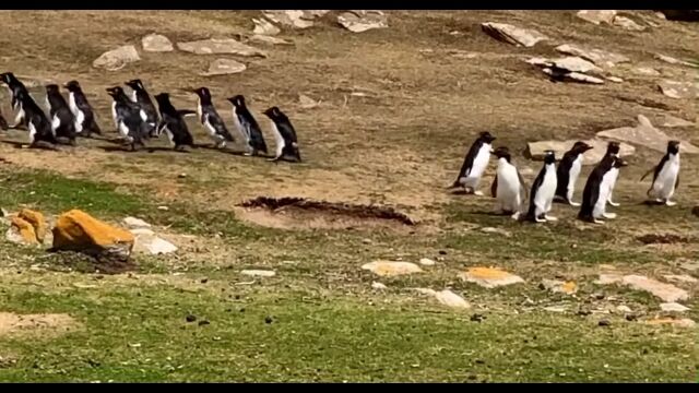 フォークランド諸島で撮影された、イワトビペンギンの群れ同士の一瞬の邂逅。