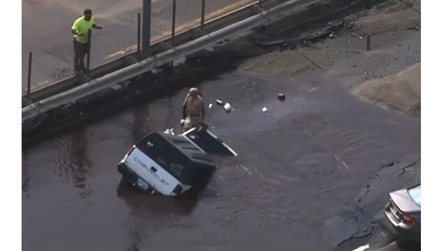 大きな穴は溜まった水で見えなくなっていたため、大きな水たまりだと思って走行したトラックが転落。