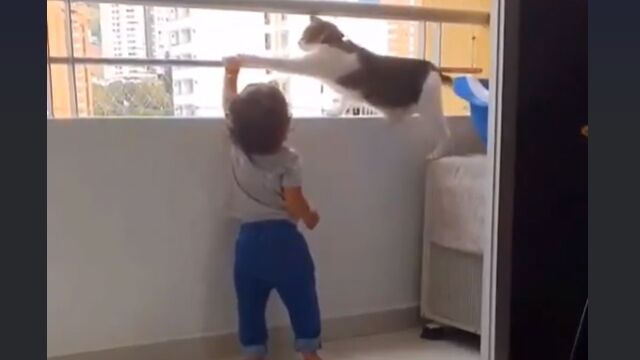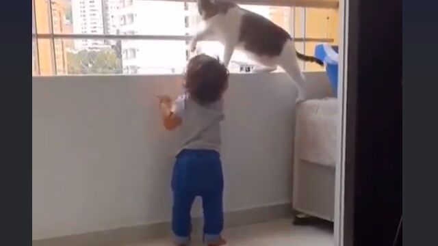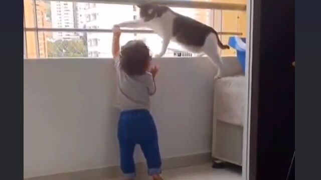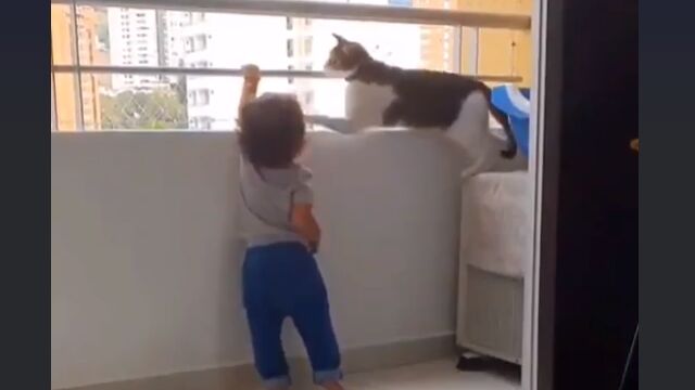 ベランダによじ登ろうとする幼児を止める猫が賢くて優しい