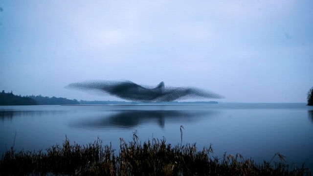 大規模なムクドリの群れが、複雑に形を変え続けるその一瞬、群れ全体の形が大きな鳥のような姿に。