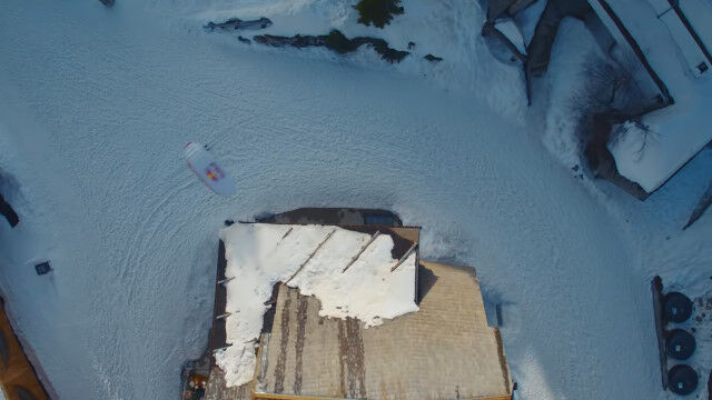 屋根に積もった雪をゲレンデに、建物の上を滑りまくるプロ・スキーヤー