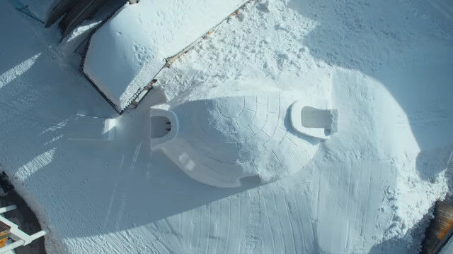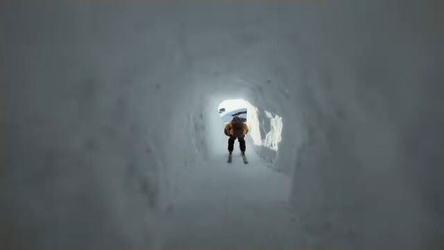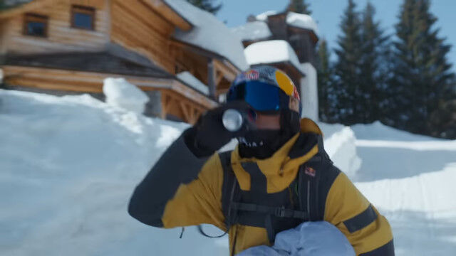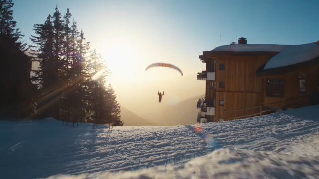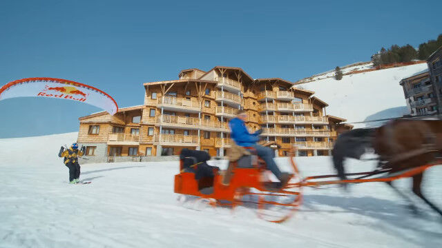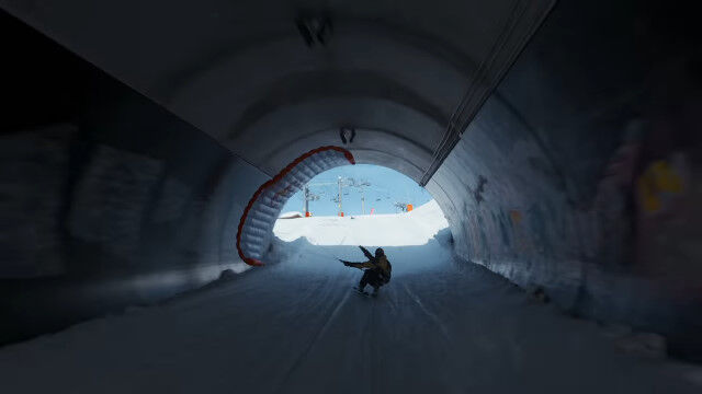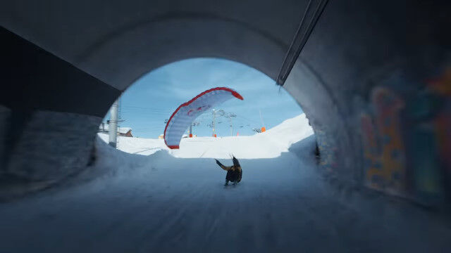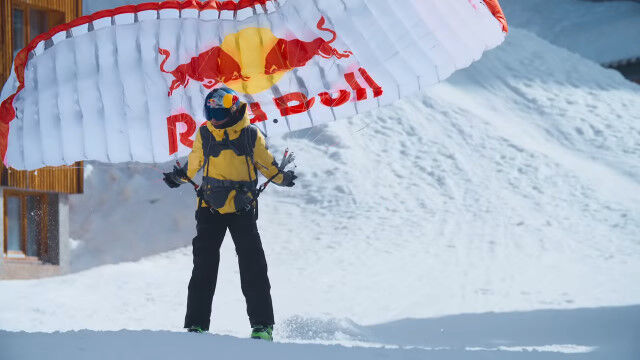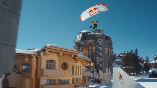 ビル外壁に設置したレッドブルのロゴを蹴り、屋上に積もった雪の上をかすめて滑り、途中でパラグライダーを収納してかまくら内を滑り、ジャンプ台で宙返り。
