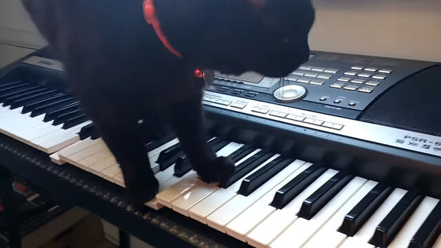 キーボードの上に乗り、鍵盤を踏みつけて音楽を奏でる黒猫のミッツィさん。