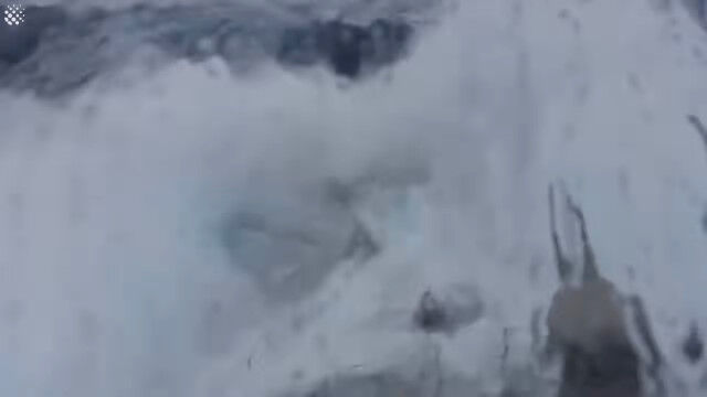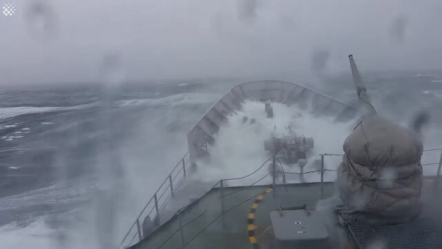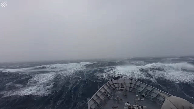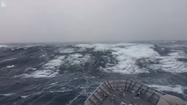 南極付近をパトロールしていたニュージーランド海軍の哨戒艦「HMNZSオタゴ」が大荒れの海で大波に突っ込む様子を撮影。