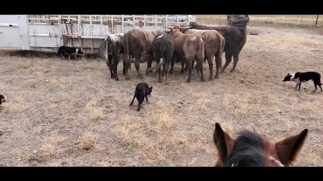 牧羊犬(牧畜犬)に口頭で指示を出し、ロデオ用のウシたちを囲んで少しずつ誘導。
