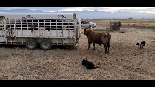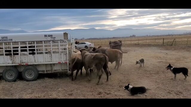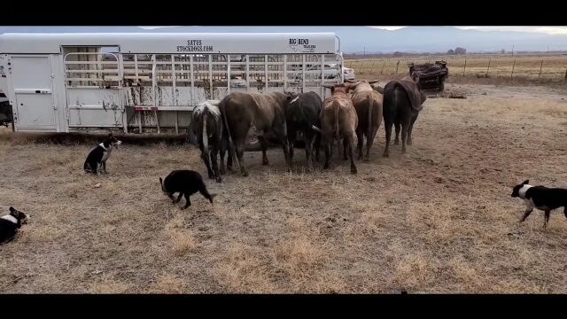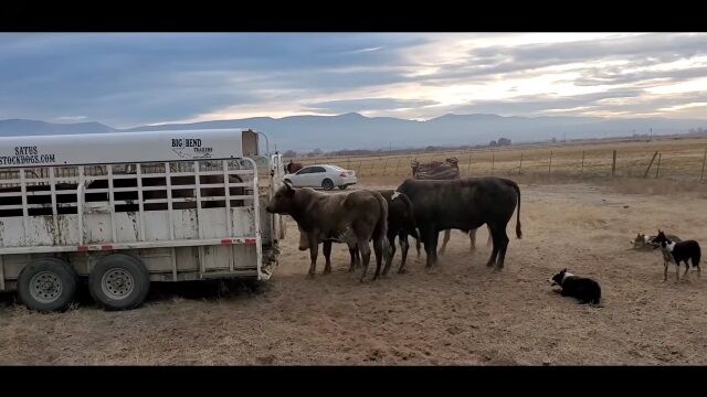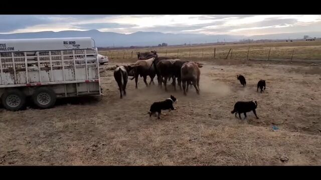 #牧羊犬に口頭で指示を出し、ウシたちを誘導。トレーラーへ積み込む牧場�