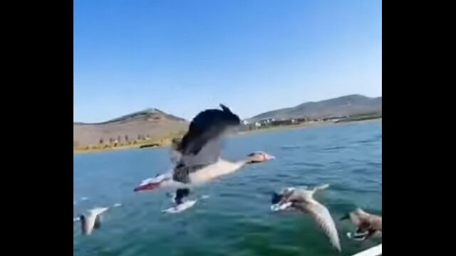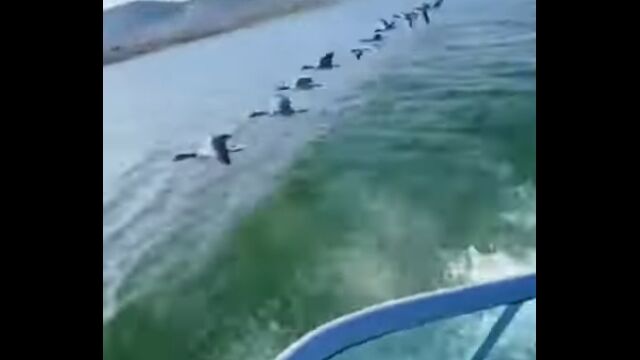 水面スレスレを低空飛行する雁の群れのV字編隊飛行。