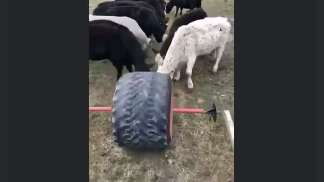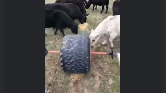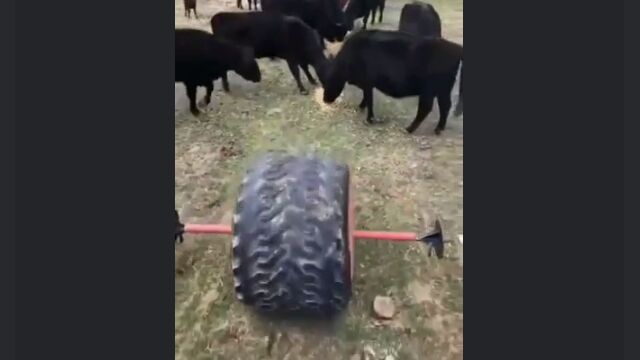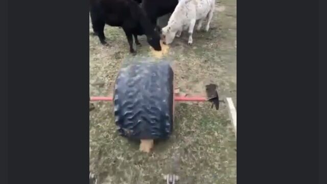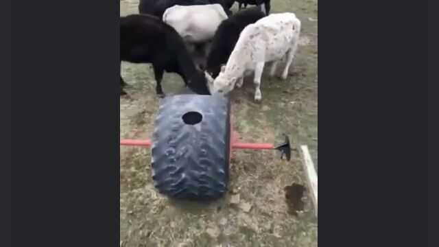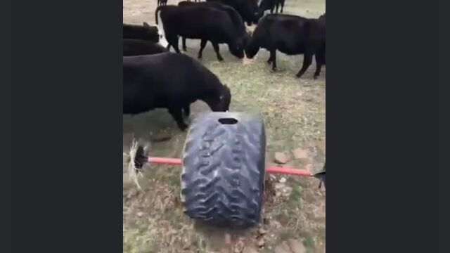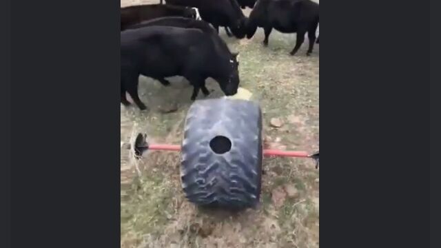 大きな古タイヤの一箇所に穴を開け、中にエサを入れたら牛の放牧エリアで転がす。