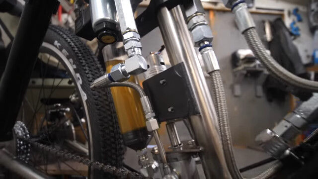 自転車のフレーム部分に油圧シリンダを仕込み、レバー操作で油圧を送り込む先を変更、走行中でも各所の長さを変えることが可能。