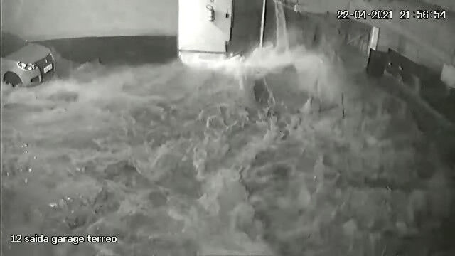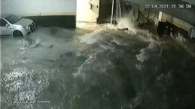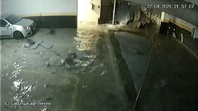 プールの底が抜ける事故。階下の駐車場に瓦礫と水が流れ込む防犯カメラ�