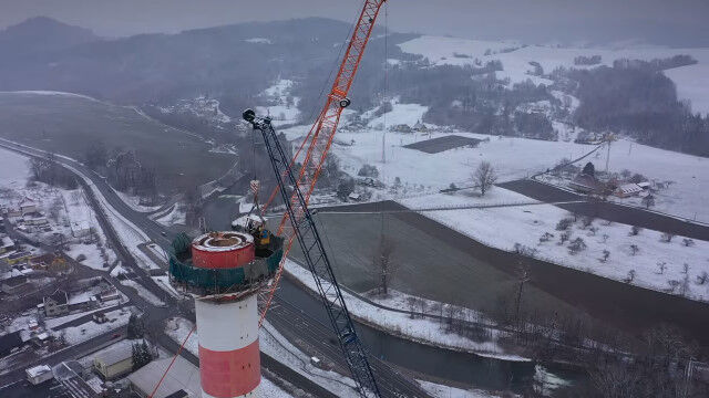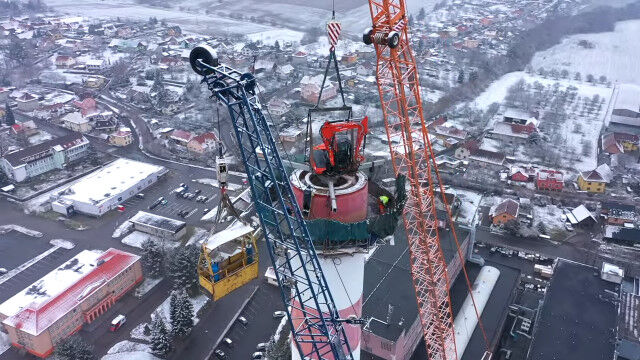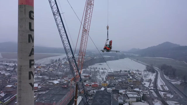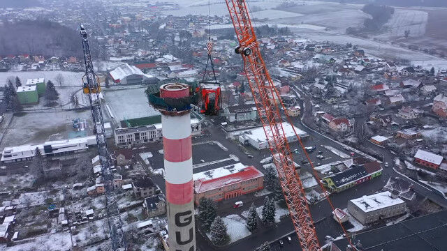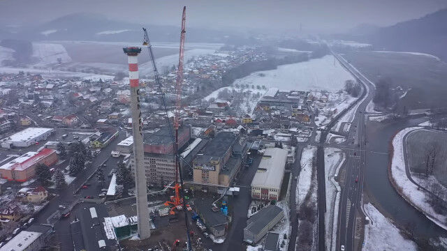 チェコ共和国の町、ズブジーで行われた、大きな煙突の解体作業。