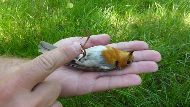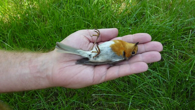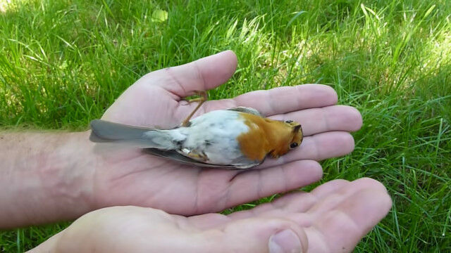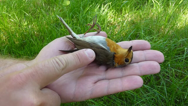 手のひらの上で死んだふり。擬死行動をとるヨーロッパコマドリ