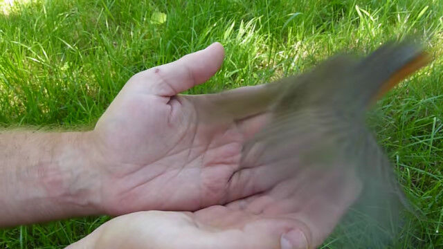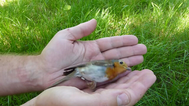 人間の手のひらの上で死んだふり(擬死)をするヨーロッパコマドリ。