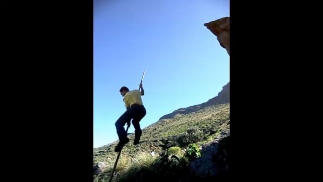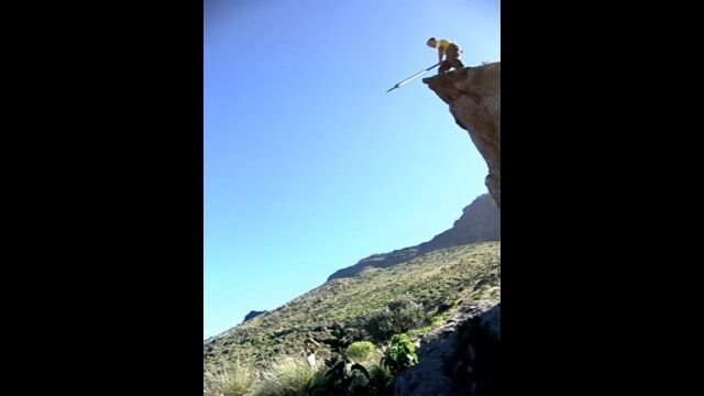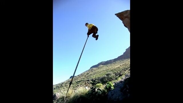 落下ダメージも槍で軽減。長い槍を駆使して山岳地帯を立体移動する、カナリア諸島に伝わる伝統テクニック