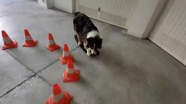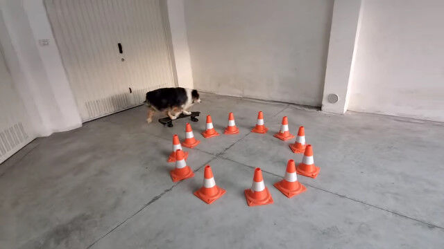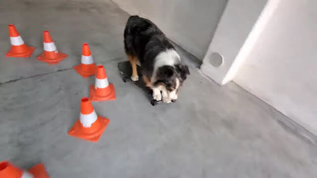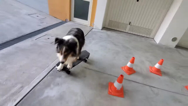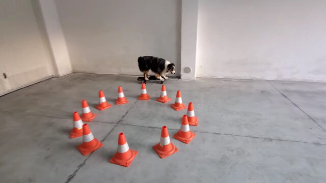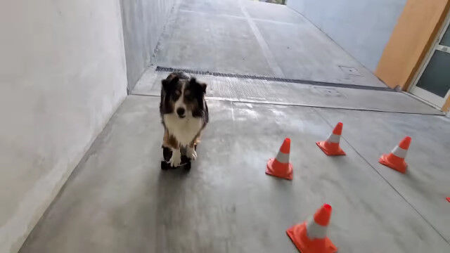 #スケボーを乗りこなし、8の字を描いて滑る犬