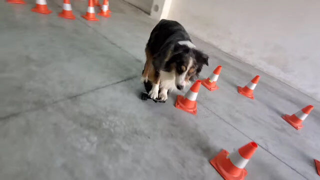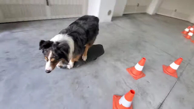 コーンで作った2つのサークルを、8の字を描いて滑るスケボー犬のラッシュくん。
