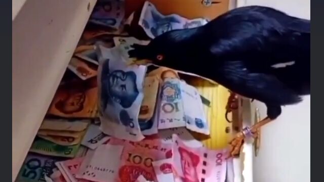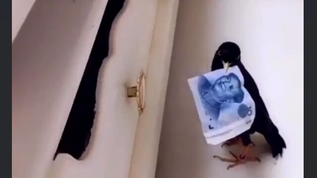 お札を拾って窓から帰ってくる鳥。