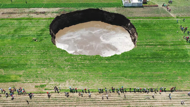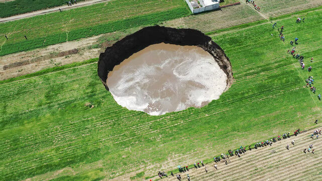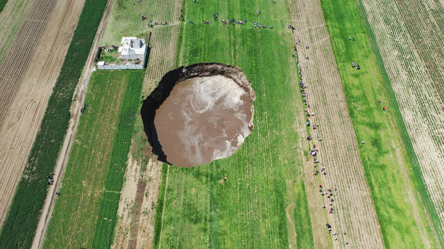 直径90メートル以上、深さは20メートル近くあり、近くに建っている農家を飲み込む恐れがあるとのこと。