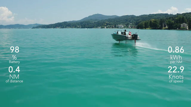 高速航行時には可動式の水中翼によって船体が水面上に持ち上がる、電動アクティブ水中翼ボート、カンデラC-7。