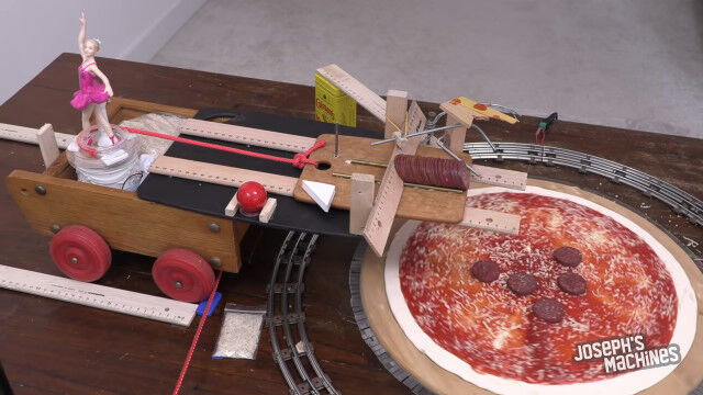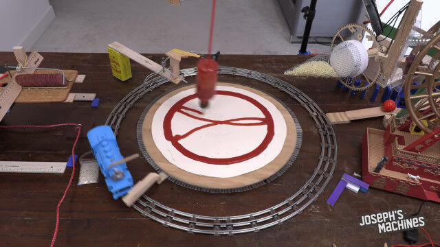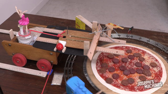 セットしたピザ生地の上にトマトソースを塗り、ペパロニとオリーブをバランス良く乗せてくれるルーブ・ゴールドバーグ・マシン。